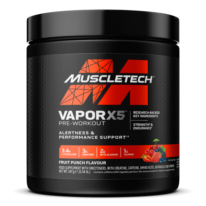 MuscleTech Vapor X5 Pre-Workout ,ofera o combinatie unica de ingrediente ,ce sustin cresterea in masa musculara, ofera energie si forta si ajuta la producerea naturala de oxid nitric. Acest supliment pre-workout cu oxid nitric iti va oferi energie si rezistenta in timpul antrenamentelor.